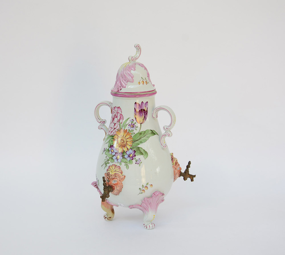 Grande caffettiera/teiera montata a samovar con tre mascheroni leonini policromi da cui fuoriescono tre rubinetti in metallo. Due manici a doppio ricciolo profilati in porpora. Decoro naturalistico policromo a mazzi di fiori. Tre piedini a ricciolo plasmati a foglie rilevate all’innesto con il corpo ovoidale. Coperchio con presa a ricciolo e foglie a rilievo (h cm 45). Restauri ad un manico ed ai piedini. Marca di fabbrica. Area tedesca, XIX secolo