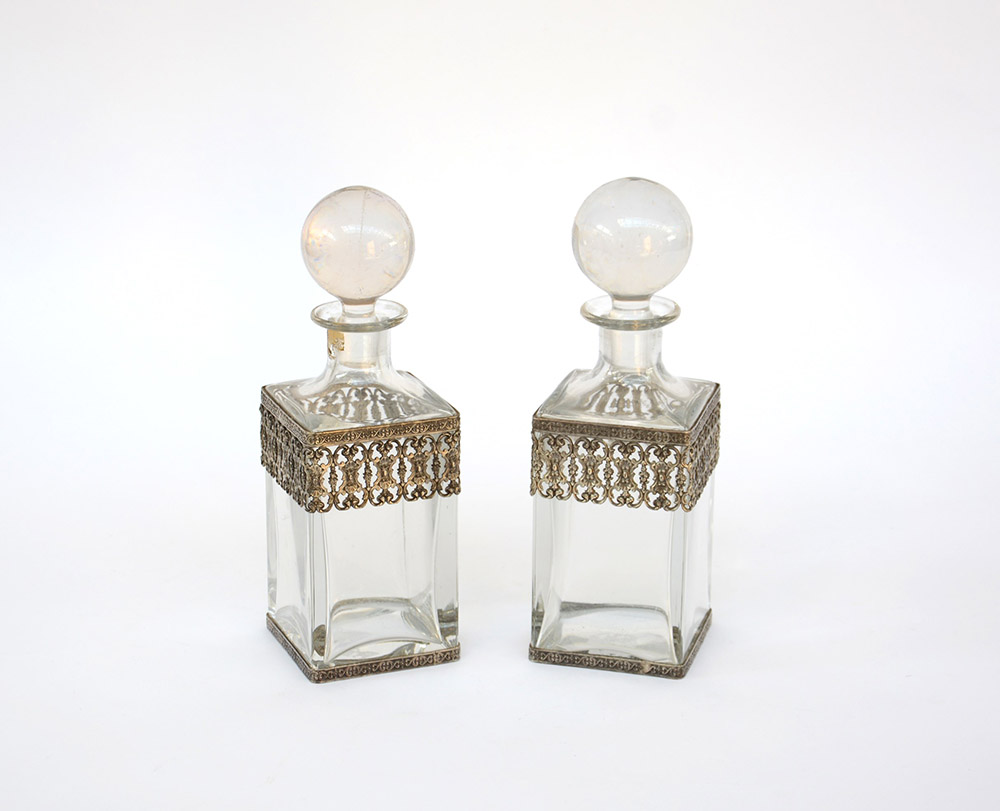 Coppia di bottiglie con tappi in vetro di forma squadrata con ghiera in metallo argentato
