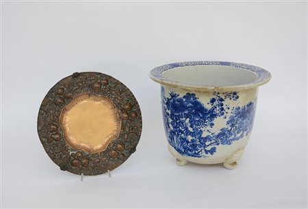 Lotto composto da un piatto in bronzo decorato a rilievo e un cache-pot in ceramica bianca e blu (difetti)