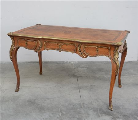 Scrivania diplomatica a due cassetti con piano in pelle e fregi in bronzo (cm 137x80x77) (difetti)