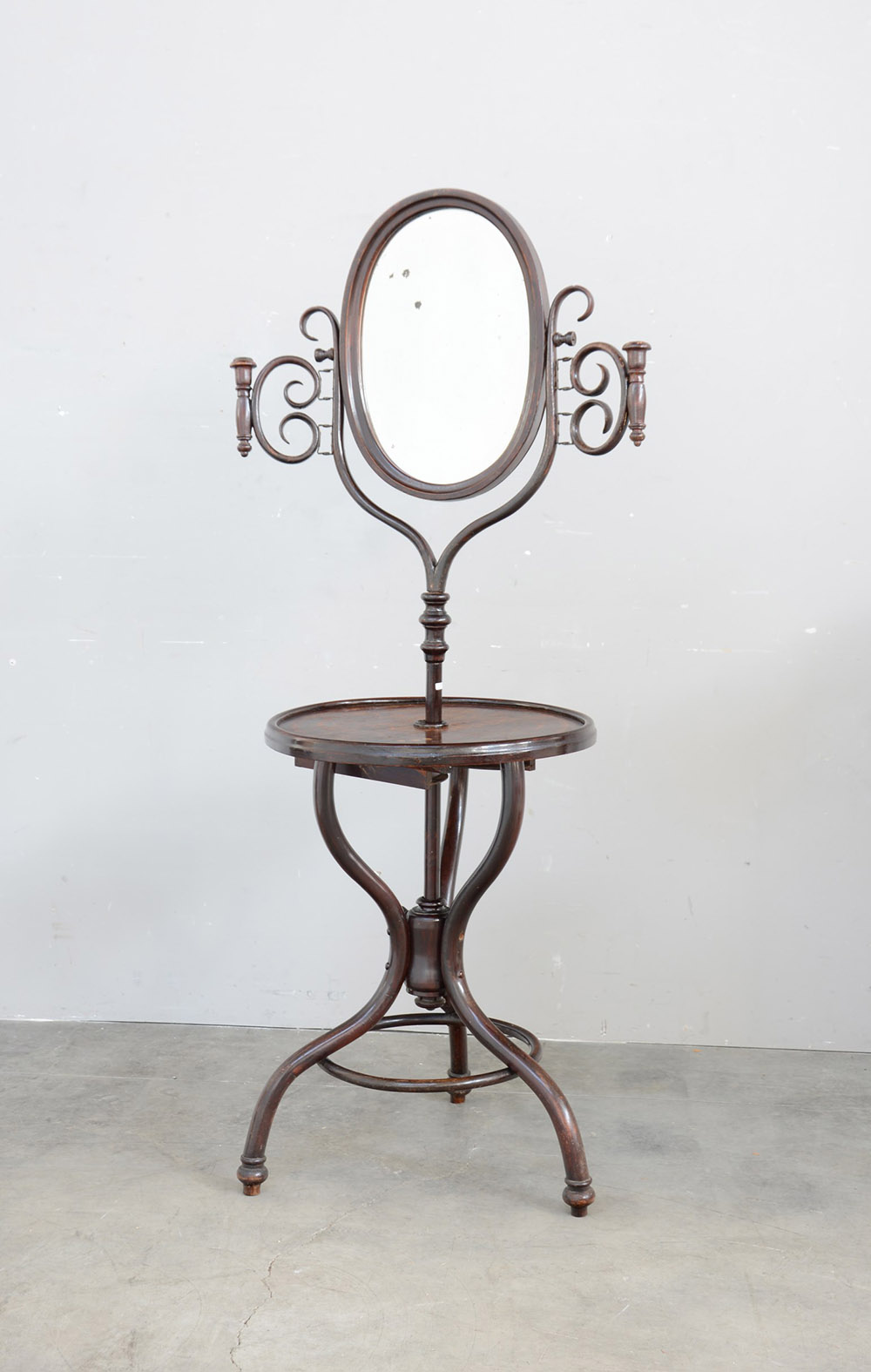Toilette da ingresso in faggio curvato composta da un tavolino tripode con piano circolare e piccolo cassetto, sormontato da uno specchio ovale al centro di due candelieri basculanti. Fine secolo XIX (d cm 54, h cm 162) (difetti)