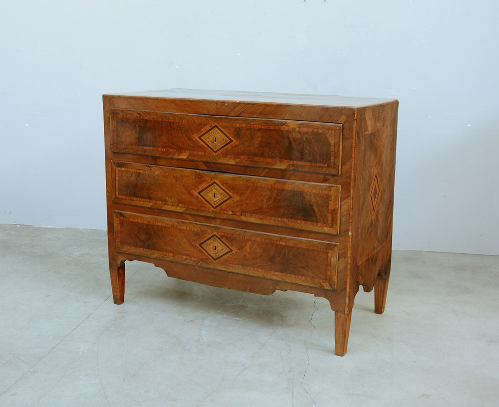 Comò a tre cassetti lastronato in noce con specchiature filettate e intarsi a losanghe; gambe troncopiramidali, grembiale e fianchi con fasce sagomate. Secolo XVIII (cm 126x106x63) (difetti e restauri)