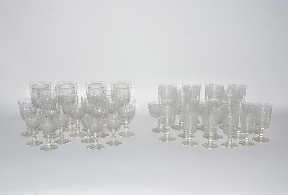 Lotto composto da due parti di servizi di bicchieri in cristallo molato e inciso (difetti)