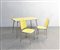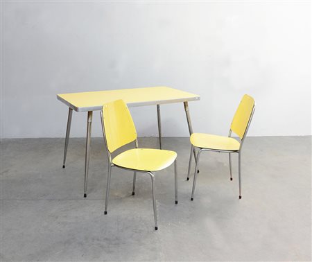 Lotto composto da un tavolo e due sedie con struttura in metallo cromato e piani in formica gialla. Italia, anni 50 (misure tavolo cm 119x76,5x69,5) (difetti)
