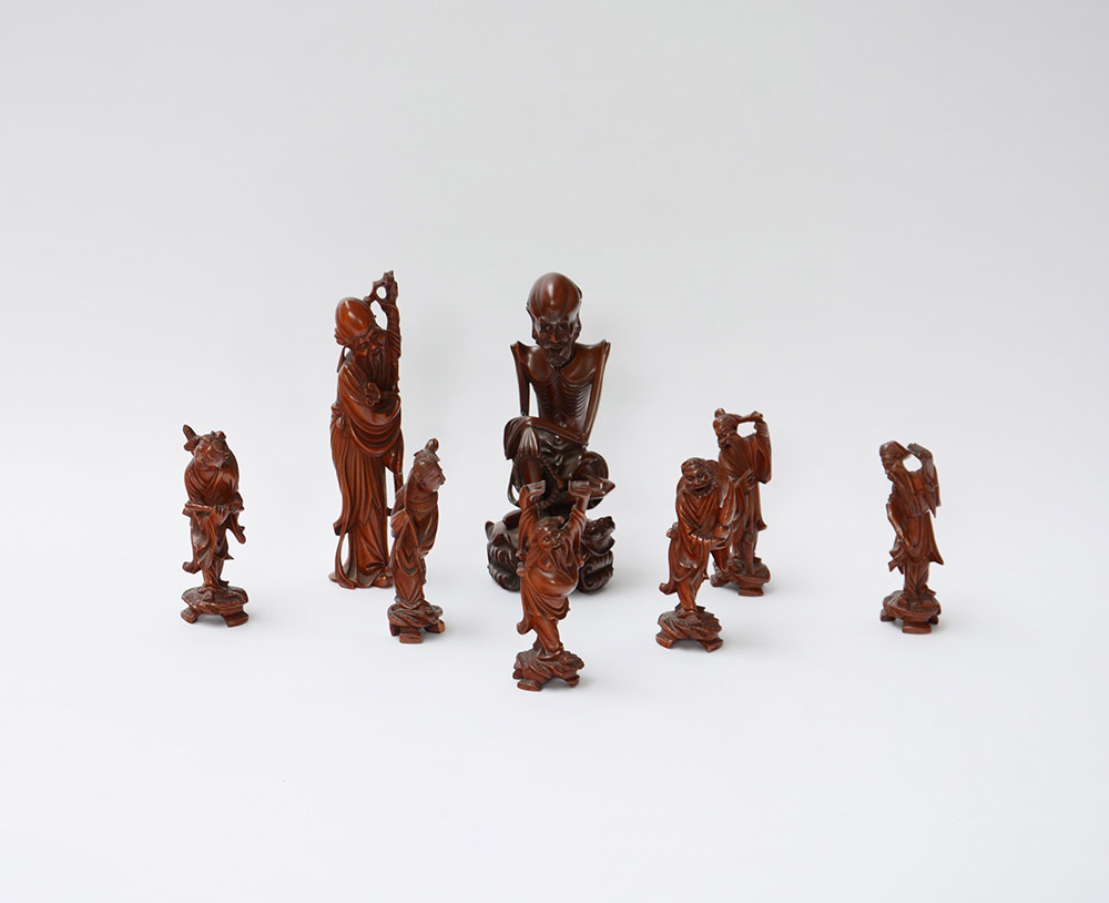 Lotto di otto sculturine in legno intagliato raffiguranti immortali e monaci...