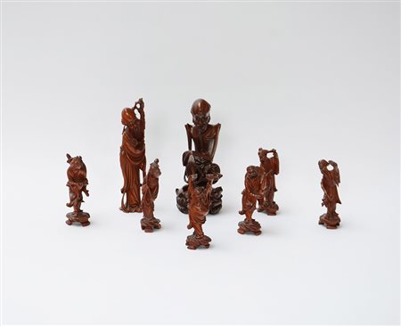 Lotto di otto sculturine in legno intagliato raffiguranti immortali e monaci taoisti. Cina, secolo XX (h max cm 20,5)(difetti)