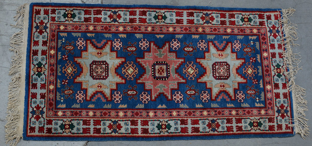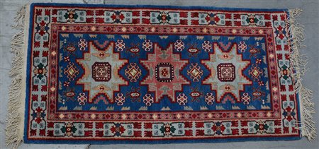 Tappeto Samarcanda, Turkestan orientale sec. XX. Disegno Lesghi con tre medaglioni su fondo azzurro (cm 190x96) (difetti)