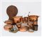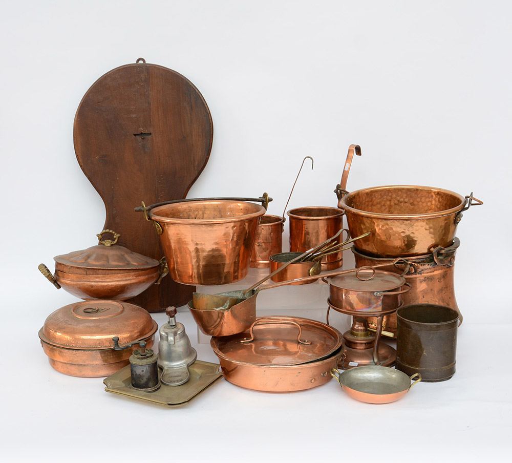 Lotto di rami: tre pentole con manico, tre contenitori con coperchio, uno scaldino, nove mestoli a scalare con manico ed un padellino biansato, uniti a sei oggetti di materiali diversi (difetti)