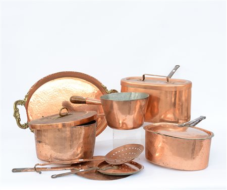 Lotto di rami: quattro contenitori con manico, un vassoio biansato, quattro coperchi ed un mestolo buco (difetti)