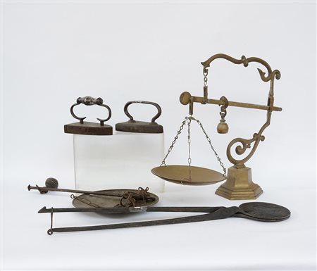 Lotto composto da due vecchi ferri da stiro, due stadere ed uno stampo pro dolci in bronzo, ferro e legno (difetti)