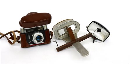 Lotto composto da una macchina fotografica marca "Voigtlander" in custodia, un visore in metallo e un flash. In custodia (difetti)