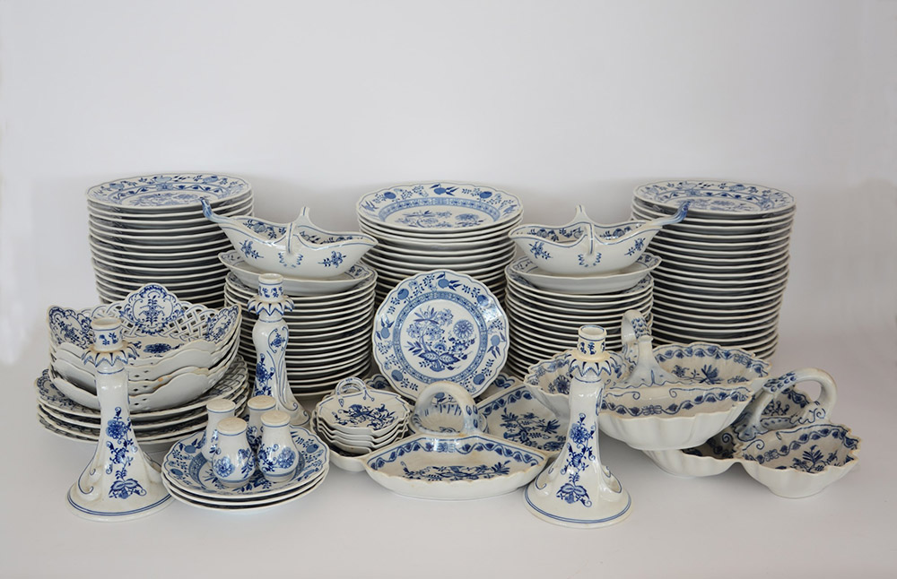 Manifattura cecoslovacca. Servizio di piatti a quindici persone con decoro “a cipolla” composto da tre antipastiere, due salsiere, otto piatti a bordo traforato, tre candelieri, piatti piani, piatti fondi e piattini (difetti)