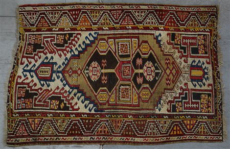 Tappeto Konia, Anatolia inizio sec. XX. Disegno a medaglione bilobato con fondo marrone su campo beige, bordura a meandro (cm 147x106) (difetti e mancanze)