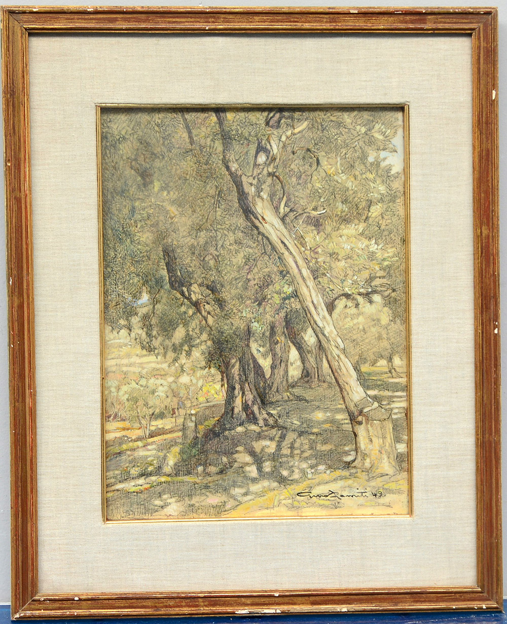 Gino Romiti Livorno 1881 1967 "Bosco" tecnica mista su masonite (cm 30x22) firmato e datato '42 in basso a destra. In cornice