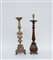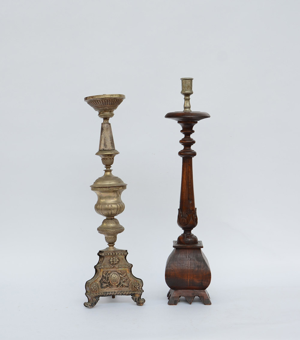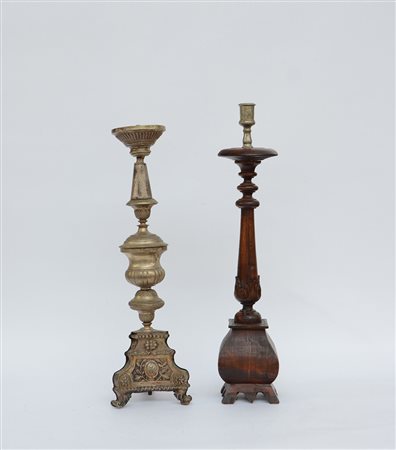 Lotto composto da due candelieri a una fiamma in metallo e legno (difetti)