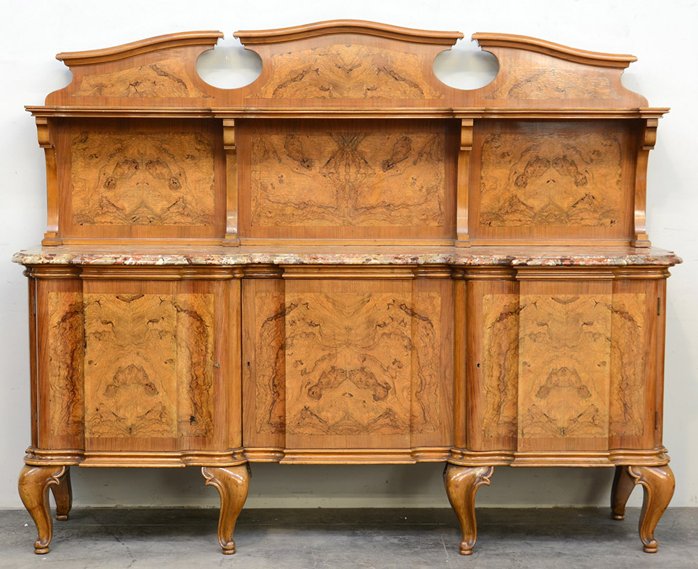 Credenza con alzata e specchiature radicate, fronte mosso a tre sportelli, piano in marmo e piedi a ricciolo (cm 224x180x61)(difetti)