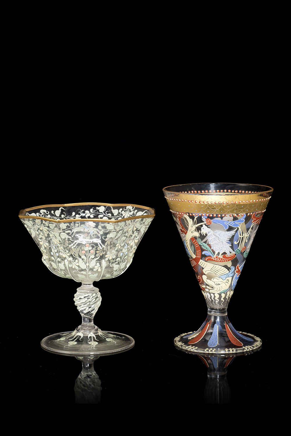 Manifattura del sec. XIX. Lotto composto da un calice e alzata in vetro incolore decorati a freddo da animali, motivi vegetali e volute