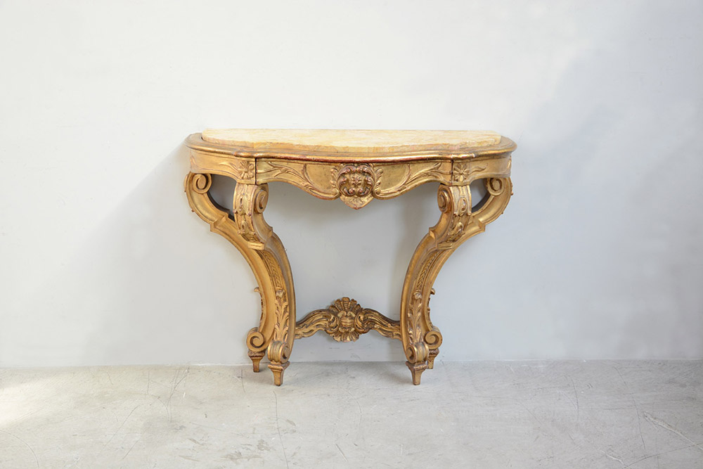 Consolle di forma sagomata in legno dorato e intagliato. Gambe mosse riunite da crociera. Piano in marmo (cm 110x85x45)