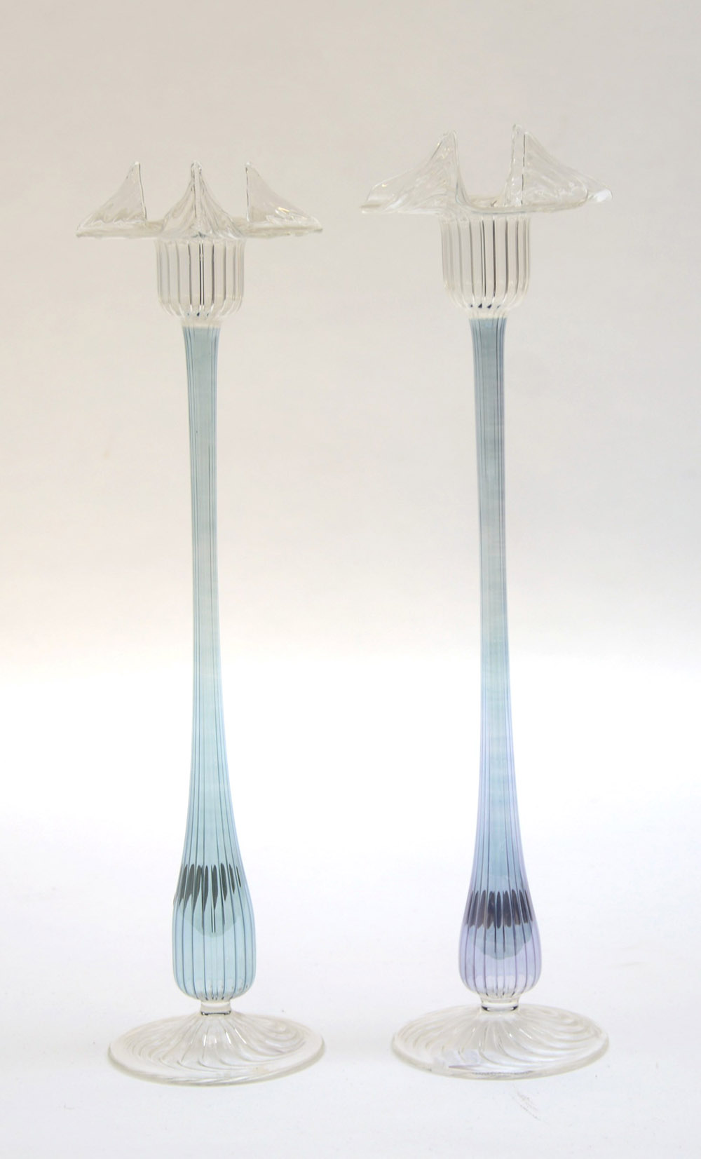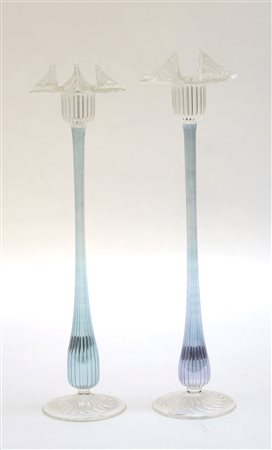 Manifattura di Murano del secolo XX coppia di vasetti portafiori a forma di fiore in vetro trasparente (h cm 32)