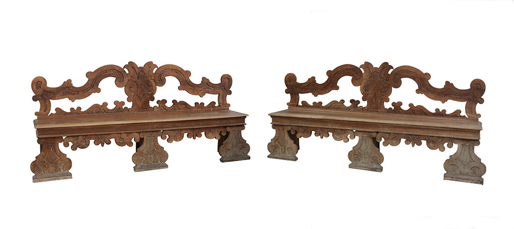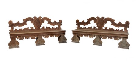 Coppia di panche da portico in noce con schienale sagomato, intagliato e traforato a volute; fascia e gambe di forma mossa. Inizio sec. XIX (cm 260x113x40)