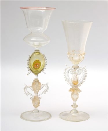 Manifattura di Murano Sec. XX, due bicchieri in vetro soffiato trasparente...