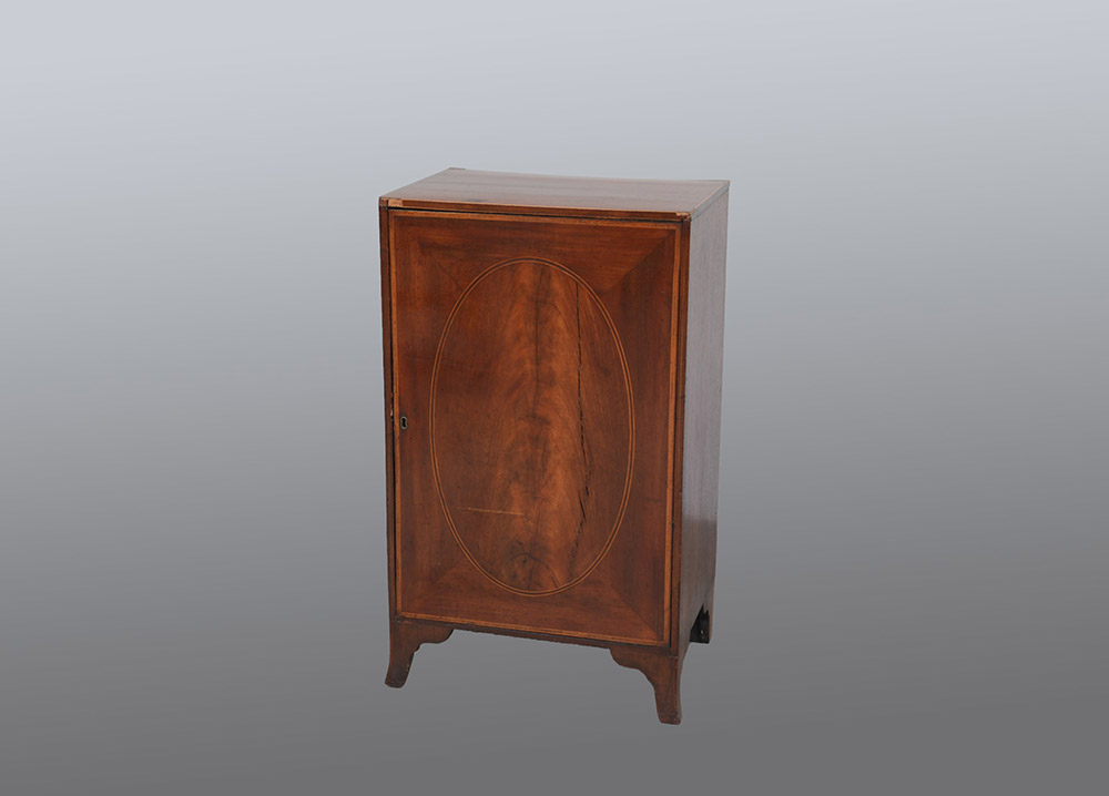 Credenzino in mogano filettato in legno chiaro ad un'anta sul fronte, piedi sagomati (cm 54x91x39) (gravi difetti)