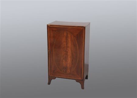 Credenzino in mogano filettato in legno chiaro ad un'anta sul fronte, piedi...