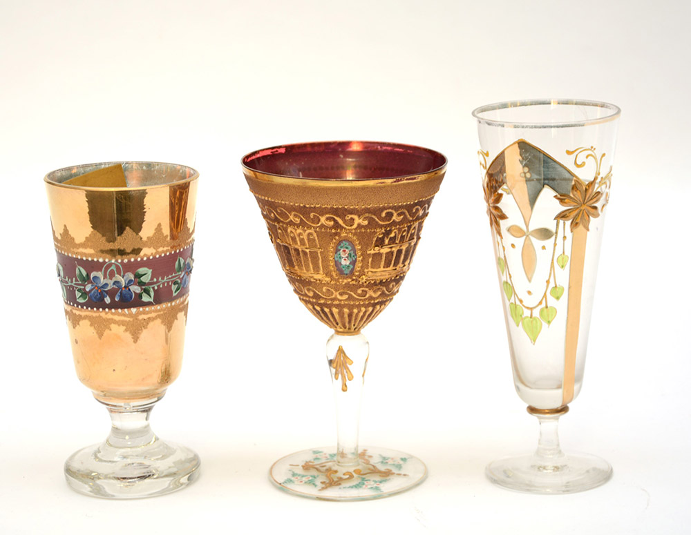 Manifatture diverse, lotto di tre bicchieri in vetro e cristallo decoratia dorature e fiori in policromia, misure diverse