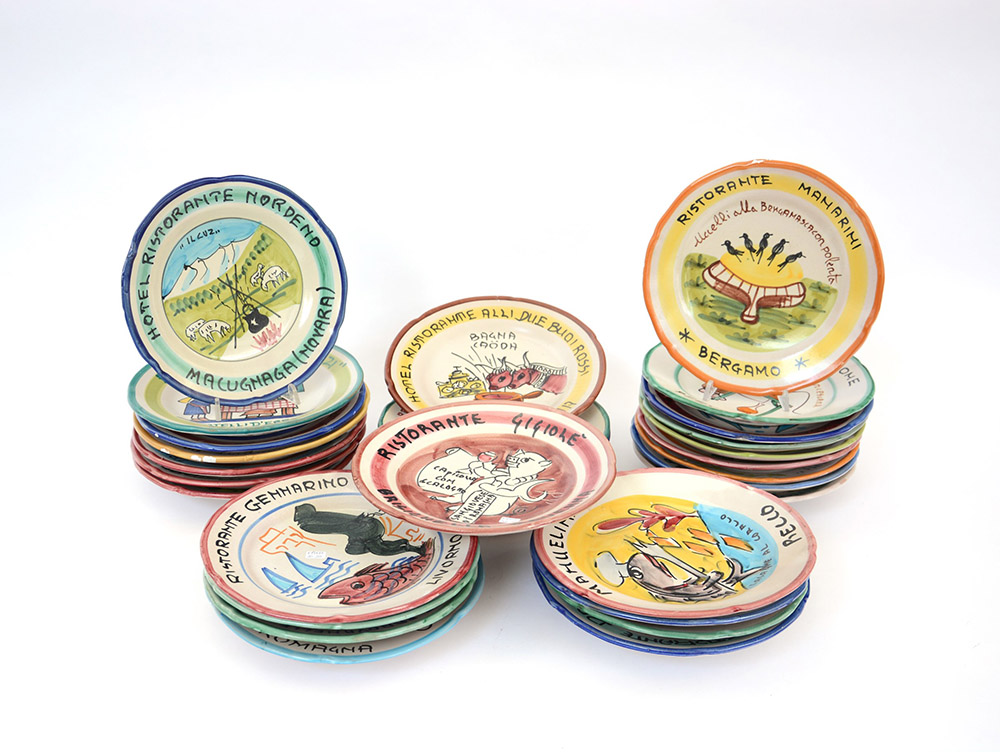 Lotto composto da trenta piatti del Buon Ricordo in ceramica smaltata in policromia sotto vetrina. Ceramiche Artistiche Solimene, Vietri sul mare, sec XX (misure diverse) (difetti)