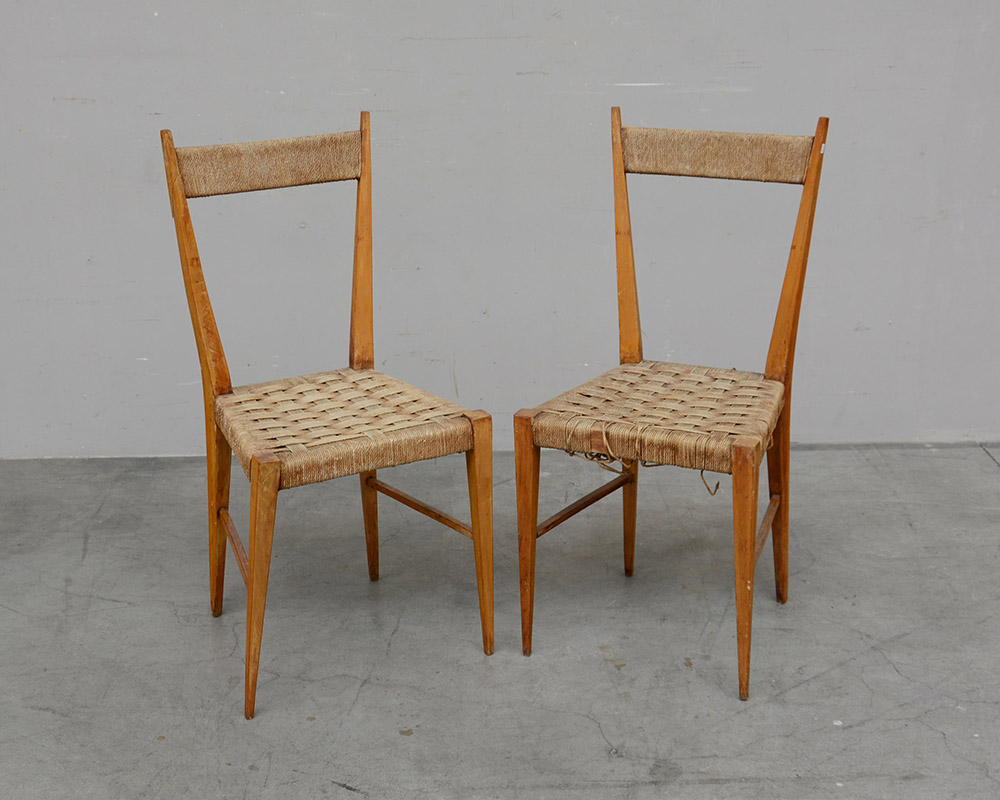 Coppia di sedie in legno massello e corda. Italia, sec XX (gravi difetti)