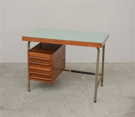 Piccolo scrittoio con struttura in tubolare metallico saldato, cinque cassetti laterali e piano in legno e formica. Italia, sec XX (cm 90x69x47)(difetti)