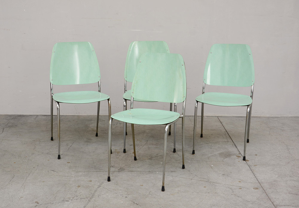 Gruppo di quattro sedie in metallo cromato e formica. Italia, anni 70 (difetti)