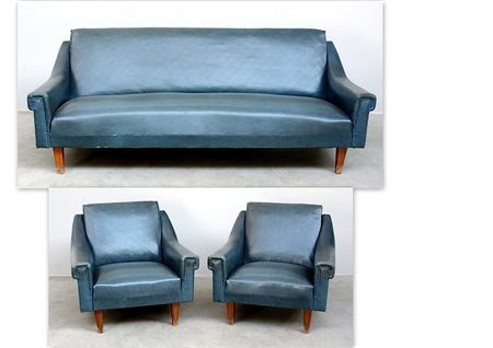 Fornitura da salotto composta da divano a tre posti e due poltrone rivestite in skai color petrolio, piedini in legno. Italia, anni '60 (cm 184x74x83 e 76x70x89) (difetti)