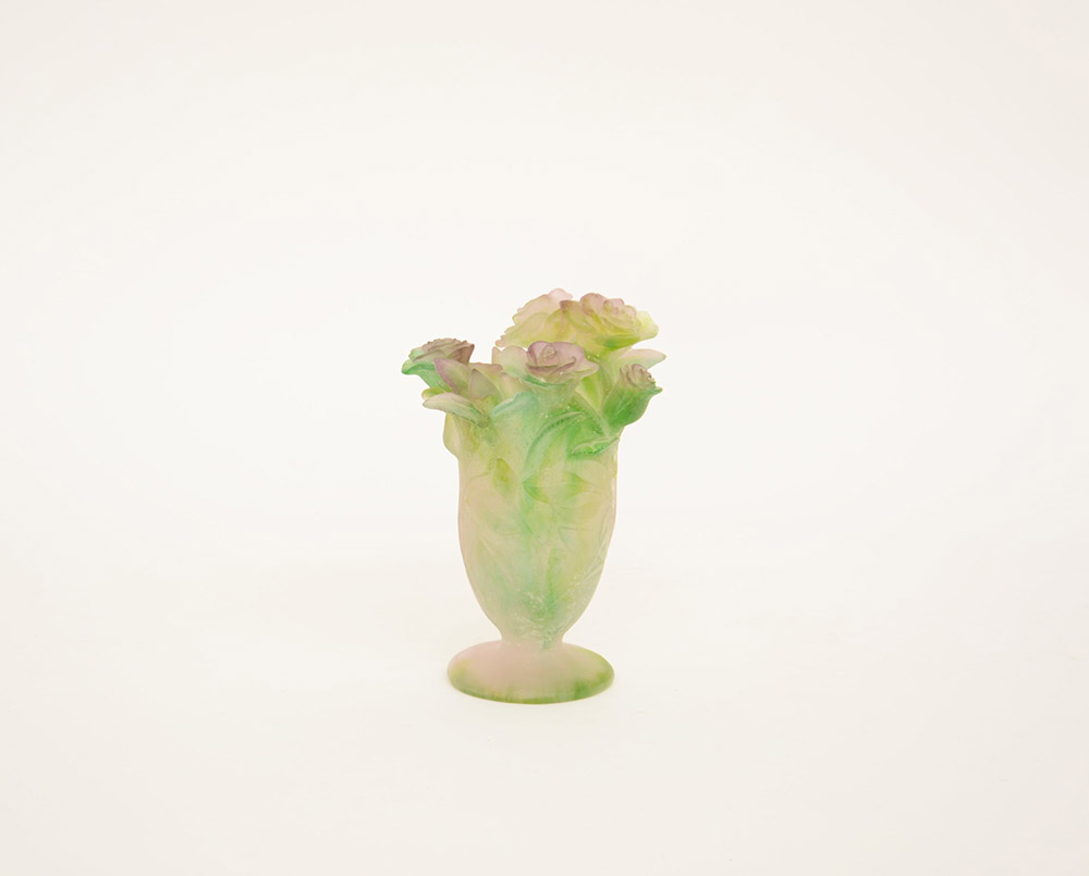 Daum, Nancy Coppa in vetro opalescente verde e ametista soffiato in stampo. Prima metà del sec XX (h cm 17,5)