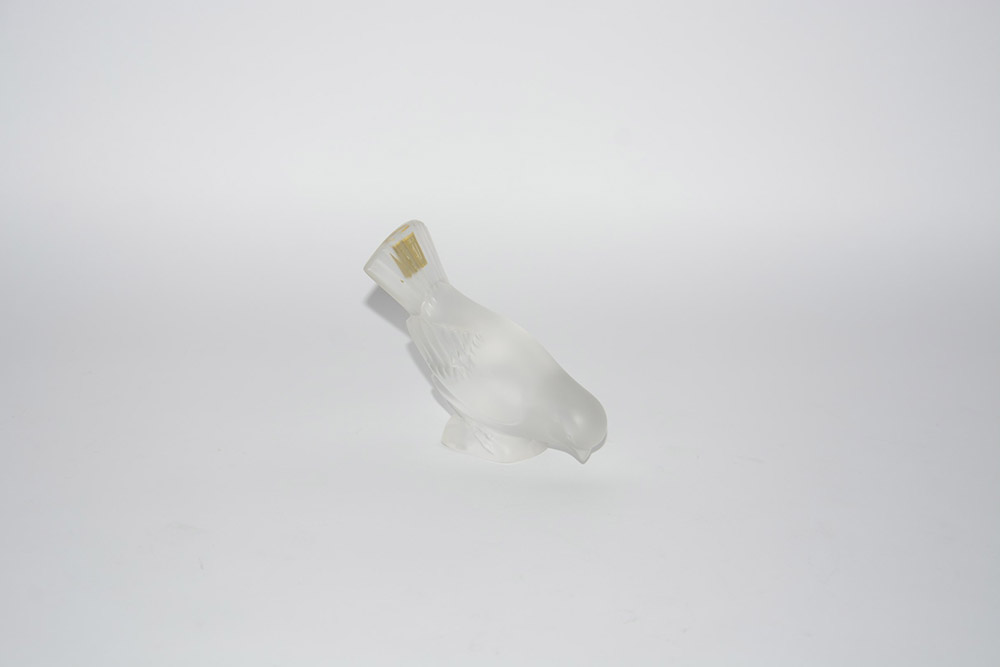 Lalique, Francia. Scultura raffigurante volatile in vetro incolore soffiato in stampo e acidato sulla superficie esterna. Firmata a punta sotto la base "Lalique France". Seconda metà del sec XX (h cm 10)