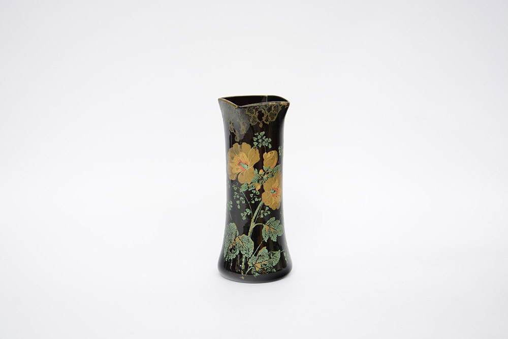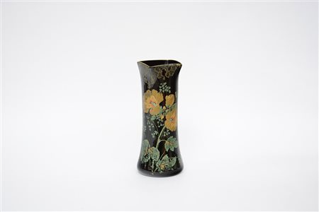 Vaso in vetro ametista scuro dipinto a mano con decori floreali. Manifattura europea. Prima metà del sec XX (h cm 28) (lievi difetti)
