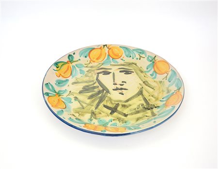 Piatto centrotavola in ceramica smaltata in policromia con volto femminile e limoni. Firmato alla base "La Giara, S. Stefano" (d cm 42,5)