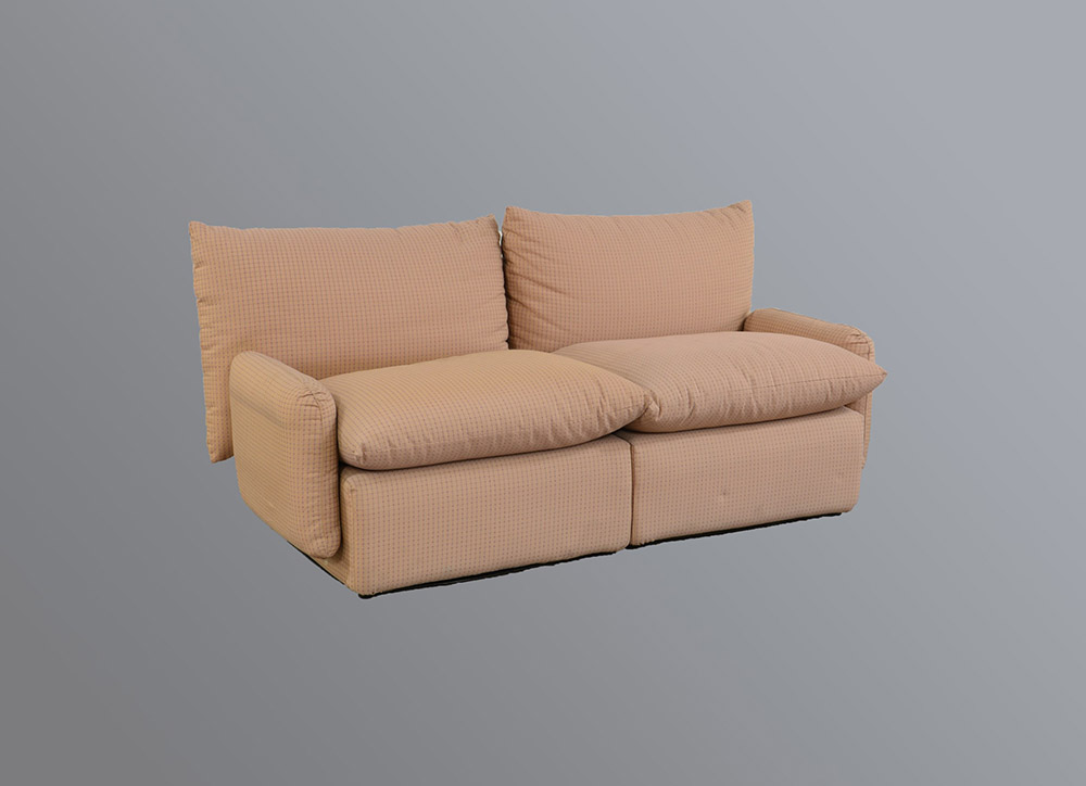 Divano a due posti modello "090" rivestito in tessuto color salmone. Produzione Elam, fine anni 70 (cm 180x82x100) (lievi difetti)
