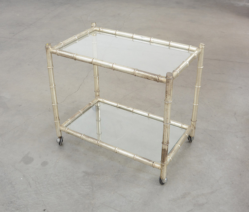 Carrello portavivande in metallo argentato decorato a finto bambù con piani in vetro. Italia, anni 70 (cm 72x64x44) (difetti)