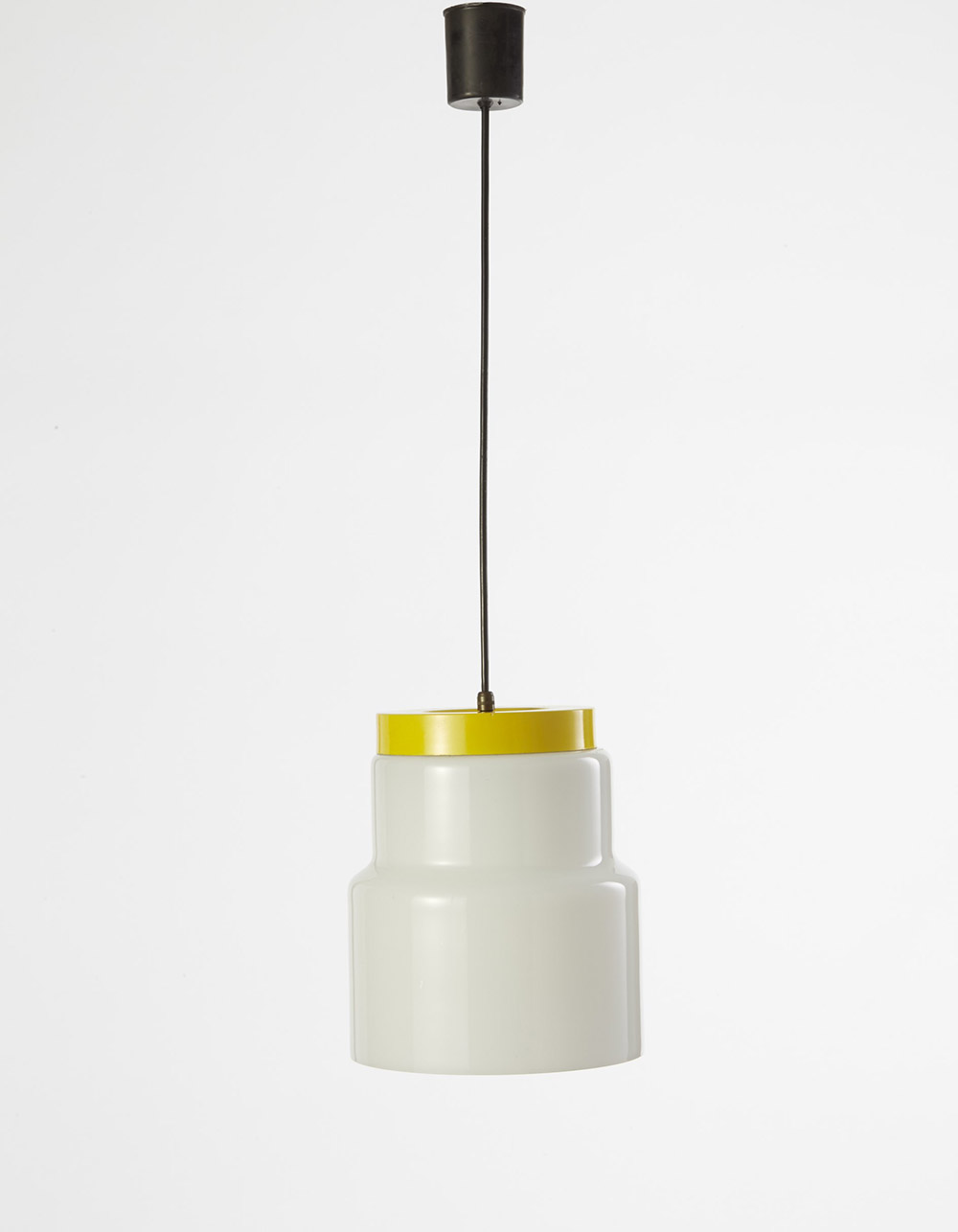 Stilnovo (attribuito) Lampada a sospensione con supporto in metallo verniciato giallo e paralume in vetro bianco. Milano, anni 60 (h cm 90) (lievi difetti)