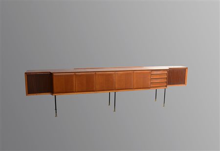 Enrico Castiglioni Busto Arsizio 1914 Busto Arsizio 2000 Grande credenza in legno a cinque ante e cassetti con gambe in metallo e ottone. Anni 60 (cm 380x92x47) (difetti)