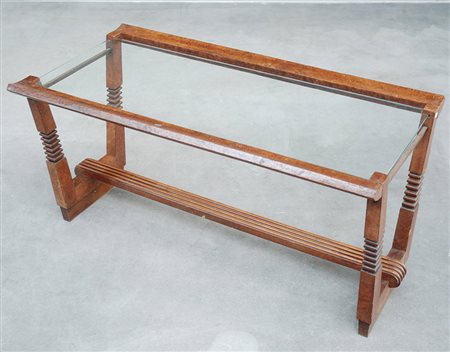 Tavolino da salotto in legno intagliato con elementi in bronzo e piano in cristallo. Produzione Colli-Torino, anni 30/40 del sec XX (difetti)