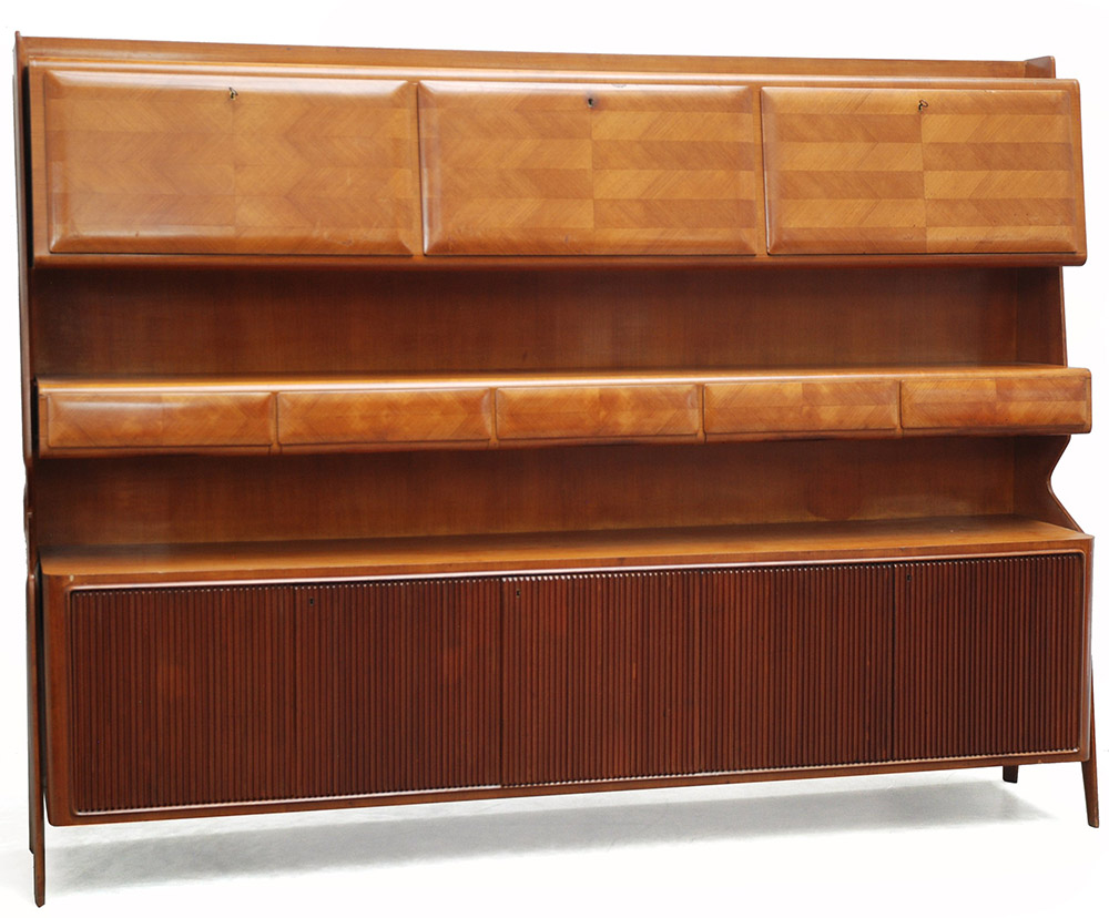 Grande credenza in legno impiallaciato in noce a tre ordini rispettivamente ad ante con fronte grissinato, a cinque cassetti e a tre vani con anta e ribalta. Impialliciatura esterna a lisca di pesce e interni in acero. Cavalletti laterali sagomati a due gambe. Esecuzione italiana, anni 50 del sec XX (cm 228x171x46) (lievi difetti)