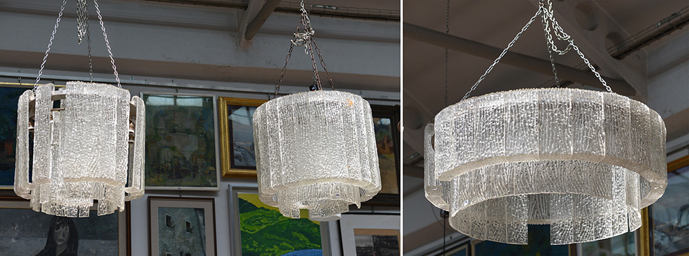 Manifattura di Murano, lotto composto da un grande lampadario con struttura circolare in metallo e pendenti in vetro cristallo corrugato, unito a due lampadari analoghi di dimensioni minori. Fine anni 60 (difetti e mancanze)
