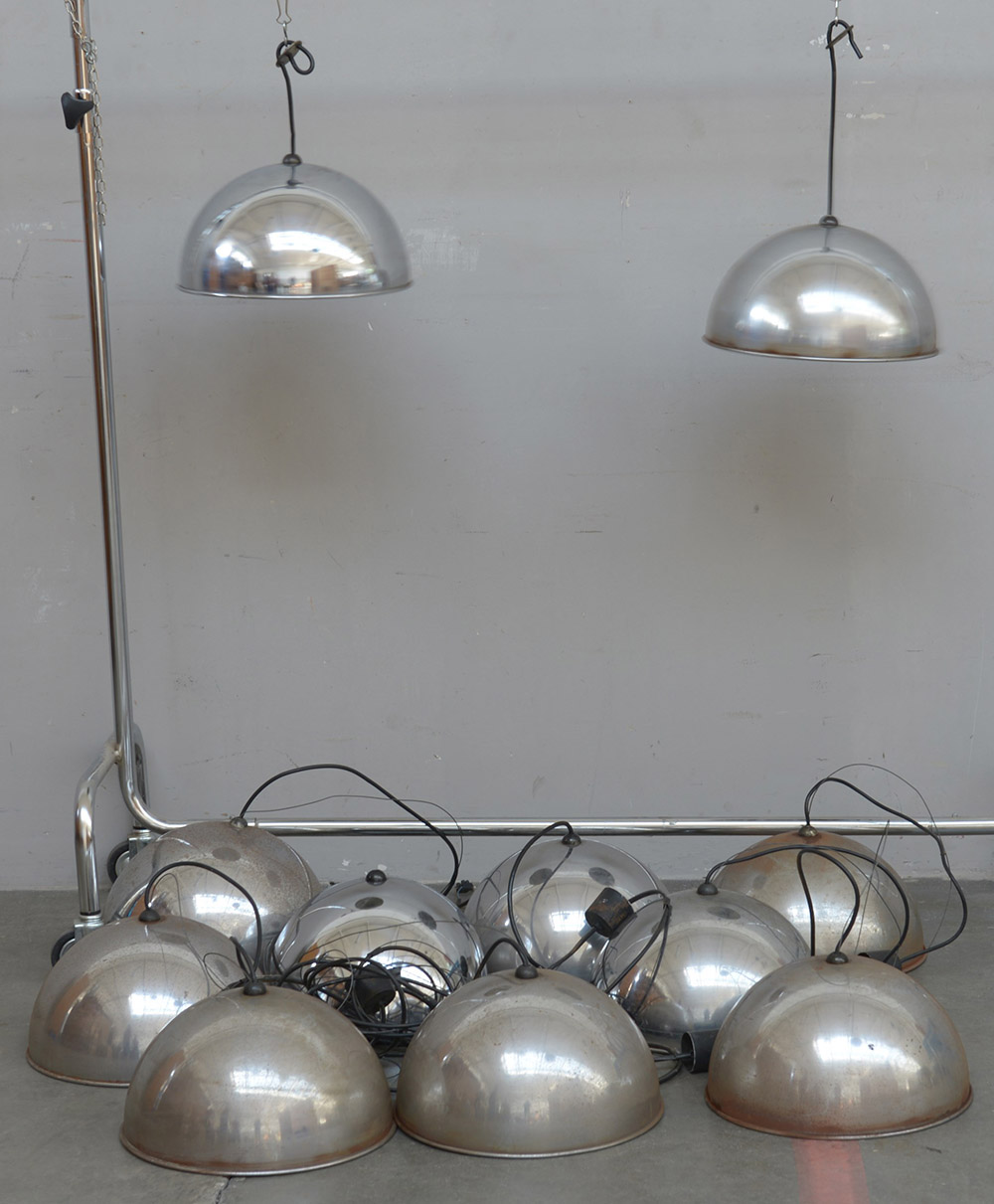 Lotto composto da undici lampade emisferiche in metallo cromato e laccato bianco. Italia, anni 70 (d cm 34) (difetti e mancanze)