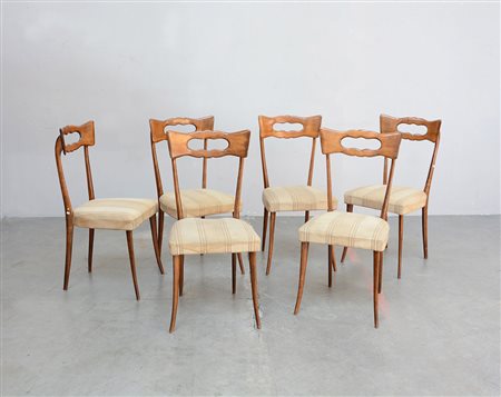 Gruppo di sei sedie in legno massello con schienale a giorno sagomato e traforato. Gambe a sciabola. Seduta in tessuto beige. Italia, anni 50 (lievi difetti)