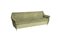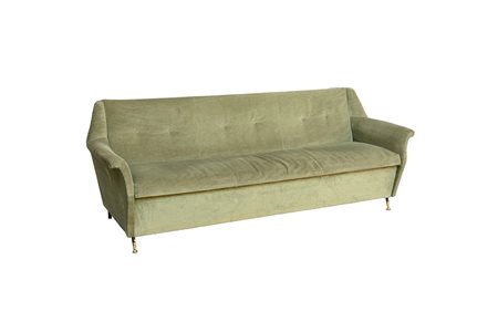 Divano letto a tre posti rivestito in velluto verde imbottito con braccioli sagomati, piedi in metallo e ottone. Anni 70 (lievi difetti)