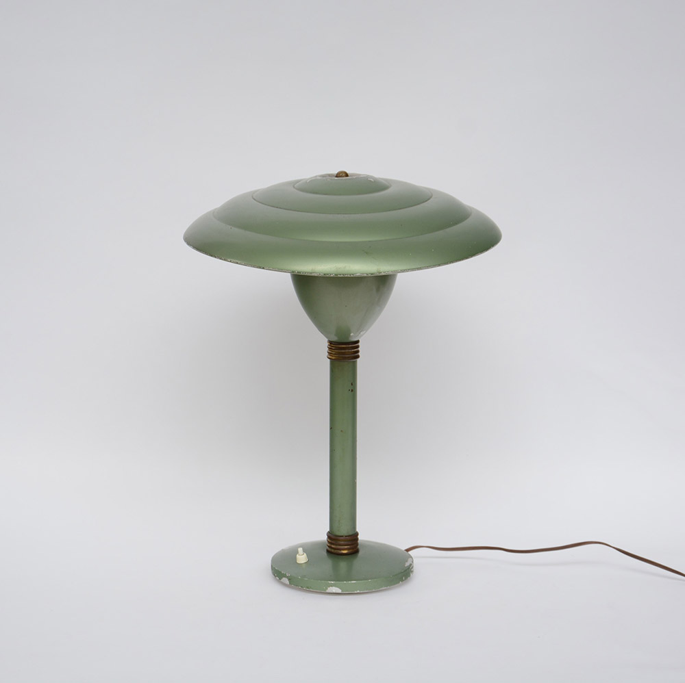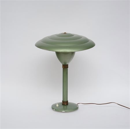 Lampada da tavolo in alluminio verniciato verde acqua. Produzione italiana, anni 30 (h cm 50) (difetti)