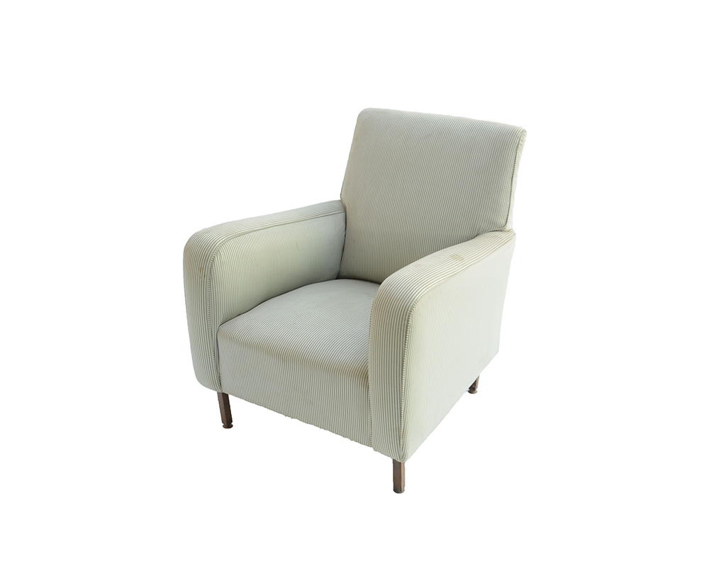 Poltrona imbottita rivestita in tessuto a righe verdine. Italia, anni 50 (difetti e mancanze)