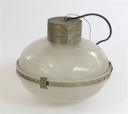 Tito Agnoli 1931 (attribuito) Lampada a sospensione in metallo nichelato e vetro stampato. Probabile produzione O-luce, Italia, anni 70 (h cm 70) (difetti)